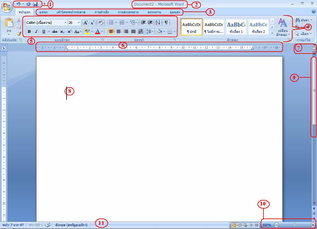 รูปแสดง การเปิดโปรแกรม Microsoft Word 2007 และไฟล์เอกสารใหม่ใช้ชื่อว่า Document1 การเปิดไฟล์เอกสารใหม่หลังจากเปิดใช้งานในแฟ้มอื่นแล้ว ในขณะที่เราเปิดทำงานกับแฟ้มเอกสารอื่น และต้องการที่จะเปิดแฟ้มเอกสารใหม่ขึ้นมาทำงานด้วย ถ้าเป็นการเปิดแฟ้มเอกสารเปล่า ให้คลิกปุ่มไอคอนสร้างเอกสารเปล่าที่แท็บเครื่องมือมาตรฐาน ก็ จะได้ Document2 หรือ Document3…5 ซึ่งจะนับต่อจากการเปิดเอกสารเปล่าไปเรื่อย ๆ